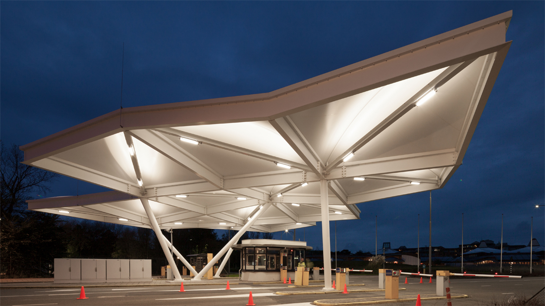De nieuwe entreeluifel voor ESTEC in Noordwijk (NL) is een lichtgewicht membraandak ondersteund door een stalen frame en slechts vijf kolommen. De entreeluifel is zodanig ontworpen dat deze een duidelijk zicht laat op het nabijgelegen restaurant, ontworpen door Aldo van Eijck.