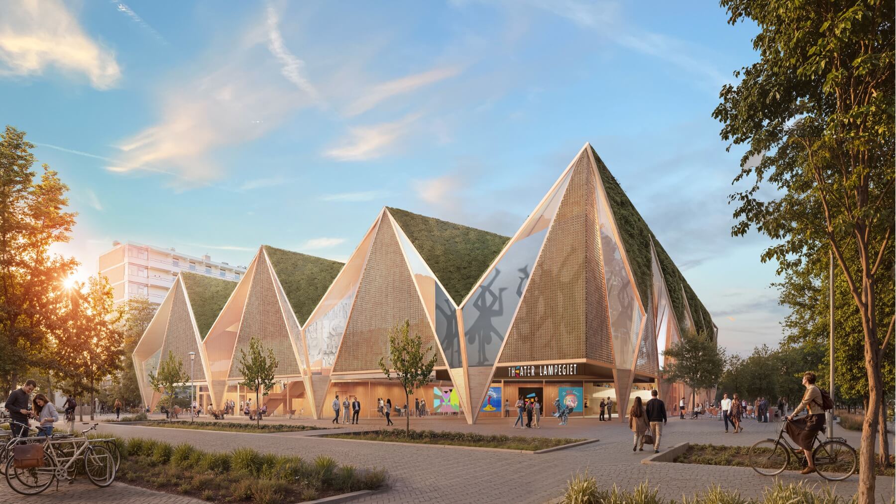 Het nieuwe Theater Lampegiet is een alzijdig, transparant en gastvrij gebouw dat zich stevig verankert in zijn context. Het verbindt Kerkewijk en park, binnen en buiten, cultuur en dagelijks leven. Een plek waar uiteenlopende doelgroepen samenkomen en waar cultuur laagdrempelig en vanzelfsprekend wordt beleefd. .